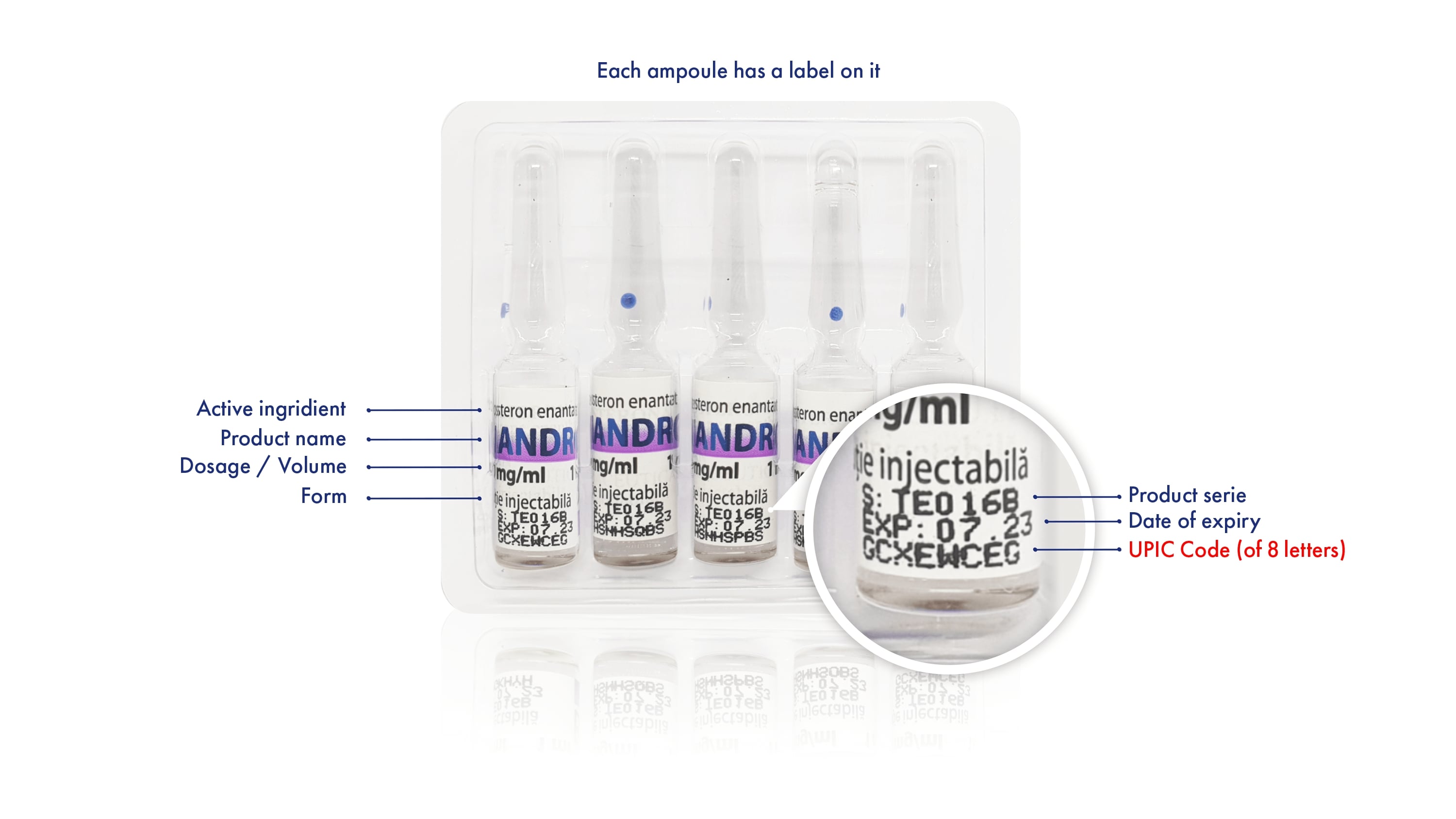 The boxes of injectibles contain 5 or 10 ampoules in plastic holders. Each ampoule has a label with printed about: the product series, the expiration date (month and year), but most importantly - the 8-letter UPIC Code.