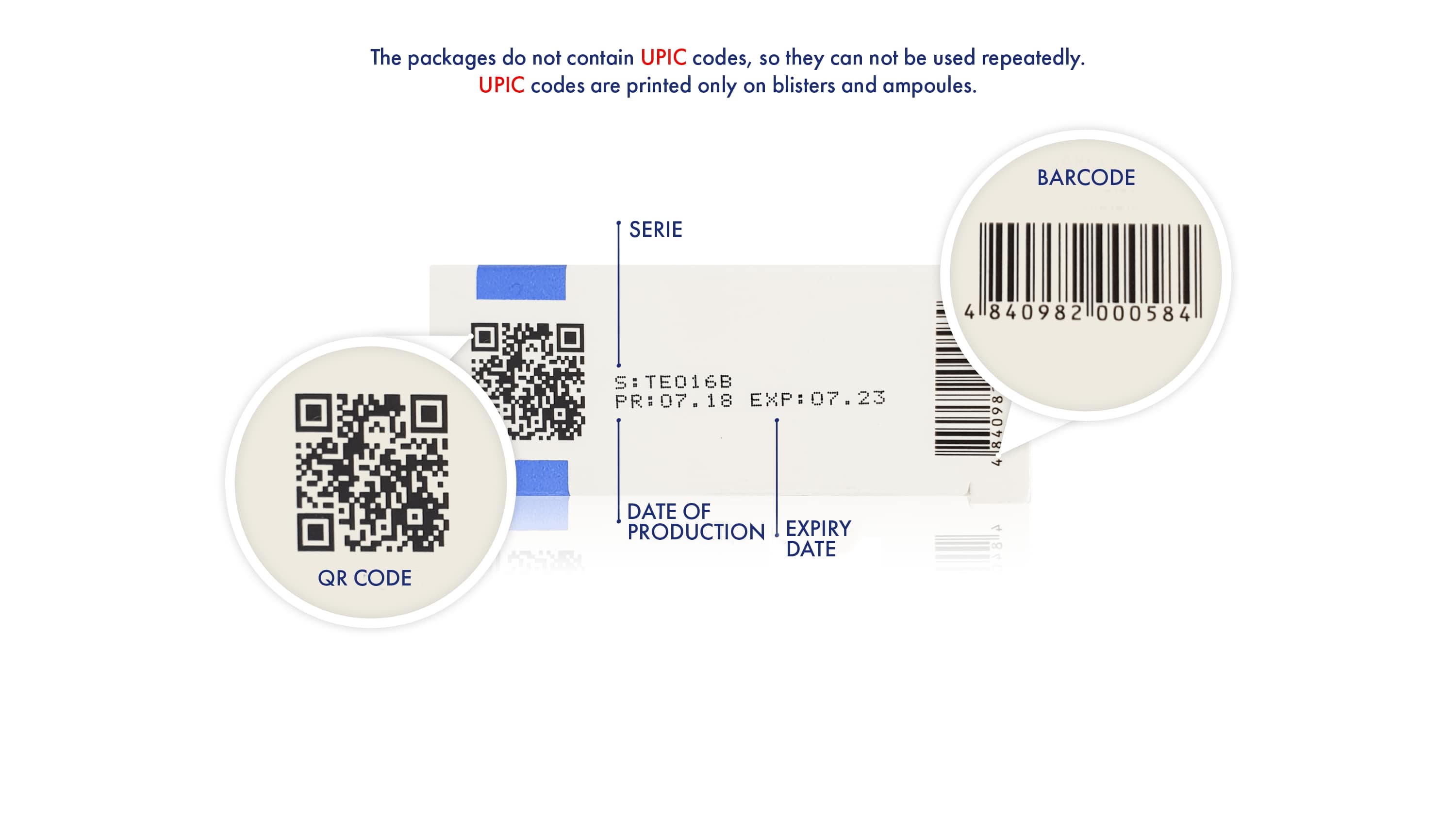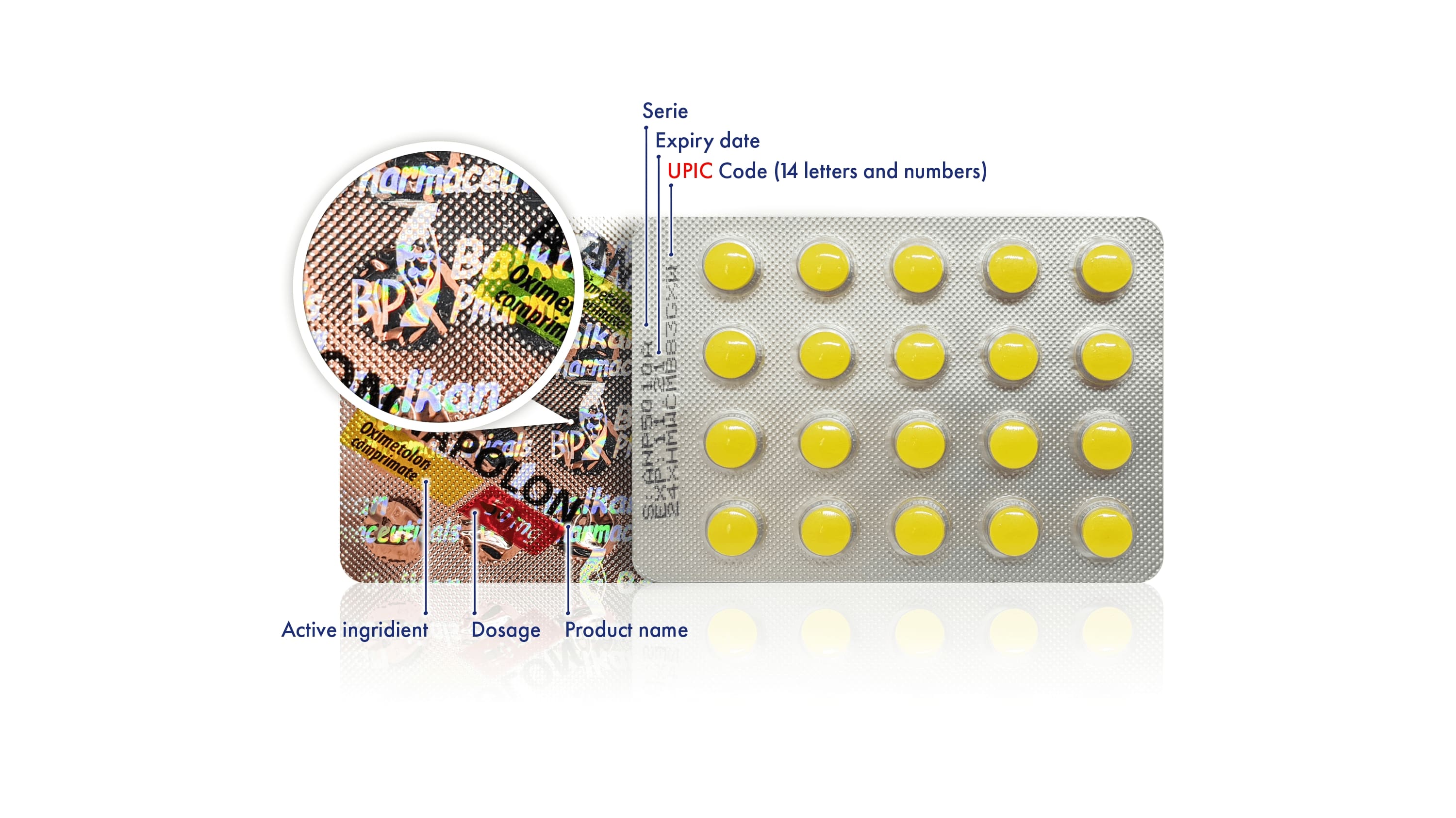 are printed on the blister face, but the most important is the unique UPIC 14-character code